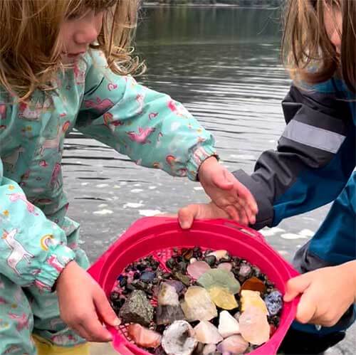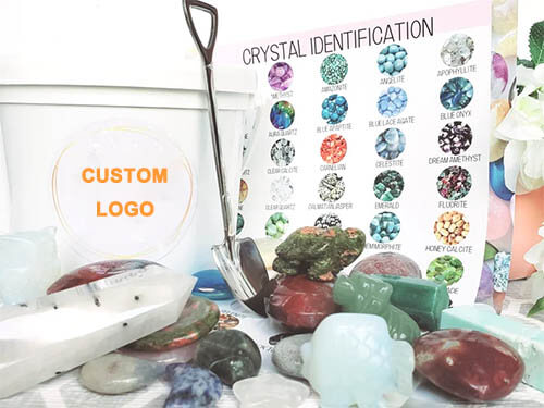 Crystal Mining Bucket – a plastic bucket filled with a blend of crystals and minerals, accompanied by digging tools like shovels and sieves, along with a crystal knowledge manual for educational enjoyment. Each crystal in the bucket is unique, providing a surprise factor and an enjoyable experience akin to unboxing.