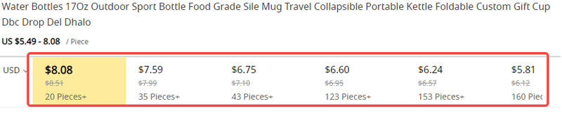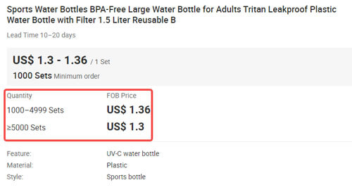If you only want to buy a few dozen products, it’s better to visit DHgate. Compared to Alibaba and Global Sources, DHgate focuses on small-scale wholesale, with much smaller required MOQs. You can clearly see the corresponding MOQ for various prices on this platform, which is much more friendly to small wholesalers. Here is an example of water bottle wholesale on DHgate for your reference.